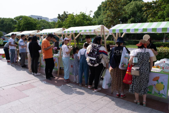 環(huán)?;照?、趣味發(fā)夾、繽紛扭扭棒,創(chuàng)意手作眼花繚亂。攤位前,大家充分發(fā)揮創(chuàng)意,一起用畫筆讓紙箱變身,一起讓帆布袋變靚,大家心懷童趣,精心設計,用DIY的方式傳遞環(huán)保理念。