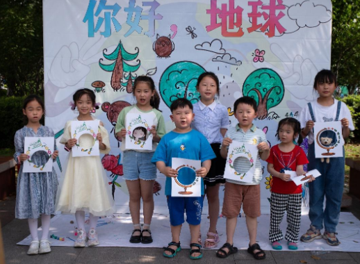 孩子們手拿鏤空畫卷,以藍天綠樹、紅花草地為背景,時而附身輕觸小草,時而抬頭便尋野花,一個個像是專業(yè)的攝影師,尋找最佳角度,捕捉最美的地球,用一幅幅作品展示了大家保護家園的信心。