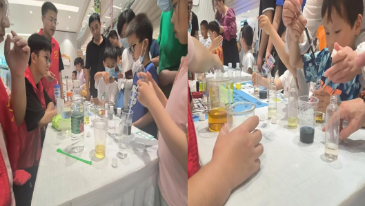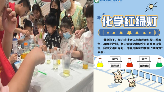 瓶內(nèi)溶液會由綠變紅最終呈現(xiàn)黃色,宛如交通紅綠燈??吹筋伾兓臅r候,少年兒童們都瞪大了雙眼,驚嘆道:“好像馬路上那個交通信號燈的顏色呀!”