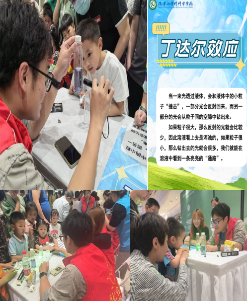 “丁達爾效應(yīng)”出現(xiàn)的時候,光就有了形狀。當(dāng)一束光透過膠體時,會和液體中的小粒子“撞擊”,一部分光會反射回來,而另一部分的光會從粒子間的空隙中鉆出來,便可以在側(cè)面觀察到明亮的光線軌跡的丁達爾現(xiàn)象。活動中,少年兒童們在裝有洗衣粉溶液的膠體中看到了清晰的光束,但是在鮮牛奶乳濁液、藍墨水的水溶液中沒有觀察到現(xiàn)象。最后講師又向少年兒童們科普,如果把牛奶稀釋到一定的倍數(shù),牛奶就從乳濁液變成了膠體,也能觀察到明顯的光路。