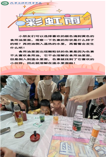 “彩虹雨”的基本原理是溶質(zhì)在溶劑中溶解性差異。色素在食用油中是以小球體的形式存在的,但是在水中卻能快速溶解,形成一縷縷“彩色綢緞”,向水面擴散??吹浆F(xiàn)象后,少年兒童們眼睛都亮亮的,閃爍著驚喜的光芒。