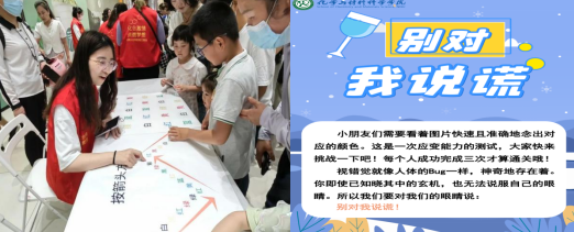 “別對我說謊”是一個鍛煉反應(yīng)能力、靈敏性及逆向思維的小游戲——少年兒童們需要看著圖片,快速且準(zhǔn)確地念出對應(yīng)的顏色。面對志愿者的一次次“為難”,他們都能快而準(zhǔn)的回答上來。雖然也有一些小朋友們“大意失荊州”,不小心讀錯了,但能抓住下一次機會,一口氣回答出來!