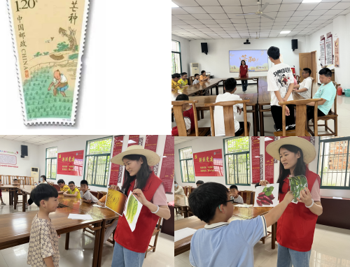 活動一開始,志愿者向孩子們展示了芒種的郵票:農(nóng)民叔叔在芒種節(jié)氣里插秧的場景。接著志愿者為孩子們表演了情景劇——《農(nóng)夫的煩惱》。“現(xiàn)在這個季節(jié),我收獲的是哪種植物啊?”“農(nóng)夫”戴上草帽,一臉發(fā)愁地問道。孩子們積極響應(yīng),紛紛自告奮勇地上前解答。現(xiàn)場氛圍濃厚。