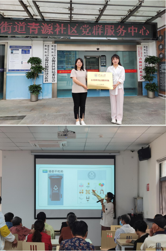 會上,雙方書記各自介紹了河海大學公共管理學院、青源社區(qū)的基本情況及黨建引領(lǐng)基層治理情況,闡述各自優(yōu)勢與資源、需求,隨后雙方進行簽約,并舉行掛牌儀式。最后,河海大學公共管理學院的2名團員志愿者,來到青源社區(qū)居家養(yǎng)老活動中心,為青源社區(qū)的老年人開展了一場垃圾分類知識分享會。