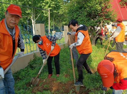 由于棲化新村社區(qū)東門停車場施工建設(shè),社區(qū)老黨員志愿者們拿著移栽工具將區(qū)域及周邊繡球花卉移植到社區(qū)新時代文明實(shí)踐站內(nèi)。
