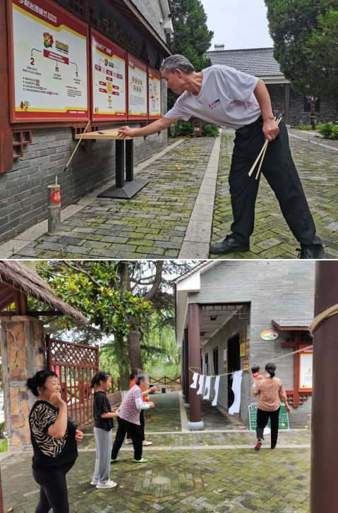 活動開始前,社工給大家介紹了端午節(jié)的由來與風(fēng)俗,讓大家了解并體驗(yàn)端午節(jié)民俗趣味游戲投壺、射五毒、包粽子。投壺是中國古代士大夫宴飲時做的一種投擲游戲,也是一種禮儀?;顒娱_始時,工作人員給村民講解投壺的相關(guān)知識以及游戲玩法,在拿到木箭后村民們躍躍欲試,在投擲中,村民用心、專注,均投擲出不錯的成績。