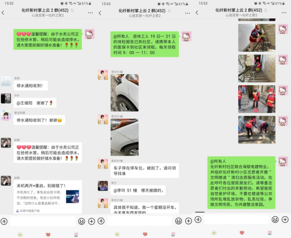 “溫馨提醒: 由于水務(wù)公司正在搶修水管,稍后可能會造成停水請大家提前做好儲水準備!”、“退休工人 19 日- 21 日的體檢報告已到社區(qū),請攜帶本人的醫(yī)??ǖ缴鐓^(qū)來領(lǐng)取。每天領(lǐng)取時間9: 00-11:00”、“化纖新村社區(qū)聯(lián)合海賦電建物業(yè)并組織化纖新村小區(qū)志愿者開展文明樓道”清掃志愿服務(wù)活動。”.......社區(qū)工作人員在掌上云微信群里及時發(fā)布實時信息,讓居民們擁有一個快速、高效的接收信息渠道。化纖新村推行“線上+線下”新型社區(qū)管理模式。社區(qū)居民可以通過掌上云社區(qū)微信群及時了解社區(qū)的最新信息和服務(wù),也可以隨時向社區(qū)反映問題和建議,社區(qū)工作人員加強與群眾溝通互動,居民提出的問題在短時間內(nèi)就能得到反饋解答。