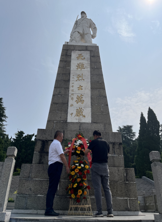隨后各位黨員踏上前往烈士紀(jì)念碑的臺階,在紀(jì)念碑前敬獻(xiàn)花圈,由社區(qū)黨委書記譚勇、社區(qū)黨委副書記馬志強(qiáng)為其整理挽聯(lián),各位黨員面對威嚴(yán)屹立的英雄墓碑,大家肅穆而立,默哀致敬,表達(dá)對革命先烈的崇敬之情。