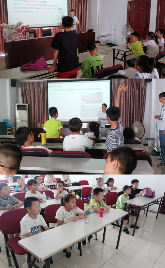 陳姝宇同學(xué)向小朋友們科普了海洋資源的種類與開(kāi)發(fā)利用現(xiàn)狀。李燕芳同學(xué)則對(duì)海洋資源遭受到的污染危機(jī)與挑戰(zhàn)展開(kāi)介紹。在科普的過(guò)程中陳姝宇同學(xué)先后就著海洋資源的種類與重要性、四大中國(guó)海進(jìn)行介紹,并與小朋友們展開(kāi)互動(dòng)。許多小朋友們針對(duì)保護(hù)海洋資源的話題發(fā)表看法并與志愿者老師進(jìn)行交流,碰撞思維火花,在知識(shí)競(jìng)答的過(guò)程中不斷加深對(duì)海洋資源的認(rèn)識(shí)。李燕芳同學(xué)則對(duì)海洋資源保護(hù)面臨的危機(jī)與挑戰(zhàn)展開(kāi)詳細(xì)地介紹,并號(hào)召小朋友們愛(ài)護(hù)海洋資源并合理利用海洋資源,并獲得小朋友們的一致好評(píng)。張爍同學(xué)對(duì)小朋友展開(kāi)暑期安全教育,讓小朋友們?cè)谙硎苁钇谟鋹偟耐瑫r(shí)保護(hù)自己。
