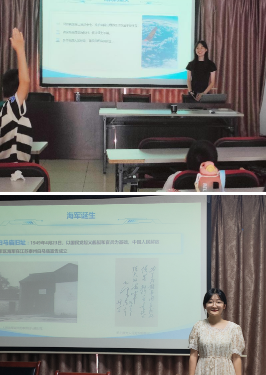 張爍同學和陳愷昕同學向小朋友們科普了中國海防的相關知識。張爍同學針對何為海防以及中國海防的歷史發(fā)展向小朋友們進行講解,并與小朋友們展開互動和討論。一幅幅定格歷史的圖片,一個個展現(xiàn)中國海防不斷發(fā)展的珍貴影像帶領小朋友們走進中國海防的歷史,在中國海防的發(fā)展歷程中感受強大的祖國和偉大的英雄,樹立小朋友們家國情懷和國防意識。陳愷昕同學則針對中國海防的現(xiàn)狀以及中國海防的偉大意義展開講解,通過耐心的講解,加深了小朋友們對當今時代是中國海防的了解,也讓小朋友們認識到中國海防對于維護國家安全和海洋權益的重要作用,在小朋友們的心中種下愛國的種子。