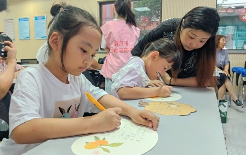 活動開始,小朋友們先在紙扇上寫下自己喜歡的關(guān)于夏天的詩,有的小朋友寫《小池》,有的小朋友寫《曉出凈慈寺送林子方》,有的小朋友寫《池上》,都是些膾炙人口的小詩,也是小學(xué)的必讀古詩,孩子們一筆一劃寫的都很認真,有兩個小朋友字寫得特別工整漂亮,一了解原來都是培訓(xùn)班學(xué)習(xí)過的。