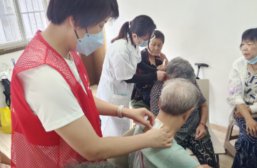 接著志愿者們依次詢問老人們的身體狀況并為老人們貼三伏貼,三伏貼是一種傳統(tǒng)中醫(yī)的治療法,結(jié)合針灸、經(jīng)絡(luò)與中藥學(xué),以中藥直接貼敷于穴位,經(jīng)由中藥對穴位產(chǎn)生微面積化學(xué)性、熱性刺激,達(dá)到治病、防病的效果。