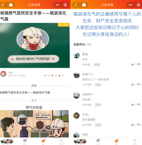 活動(dòng)前期,社區(qū)在線上發(fā)布電子版燃?xì)獍踩麄魇謨?cè),并提醒瓶裝液化氣的正確使用與每個(gè)人的生命、財(cái)產(chǎn)安全息息相關(guān),提醒大家把這些知識(shí)熟記于心的同時(shí)也記得分享給身邊的人。居民紛紛在評(píng)論區(qū)表示:“支持”、“安全最重要”。