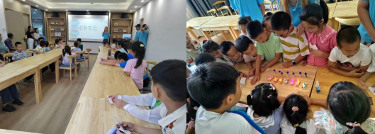 最后實(shí)驗(yàn)結(jié)束,小朋友們各自回到自己原先的座位上,聆聽接下來由志愿者講解的實(shí)驗(yàn)原理。