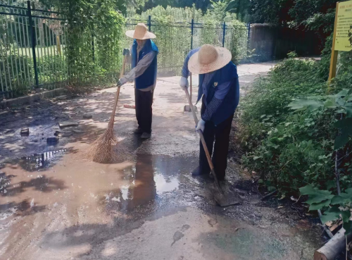 依靠北象山西高東低的地勢,在涵洞西入口,物業(yè)工作人員及志愿者認真查看現(xiàn)場情況,對排水溝等重點區(qū)域進行安全隱患排查。東入口處,志愿者們拿著鐵鍬和掃帚,及時清理下水管道堵塞的雜物垃圾,疏通窨井蓋泄水孔。在大家的共同努力下,很快就將路面積水和低洼淤泥全面清掃干凈,為車輛和居民出行提供了方便。