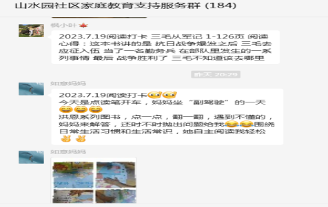 讀書打卡活動于7月14日至8月12日開展,為期一個月,活動一經(jīng)發(fā)布,群內的家長和孩子紛紛積極參與此次線上活動,在微信群里打卡上傳與孩子閱讀的照片和視頻,分享孩子的閱讀打卡心得。