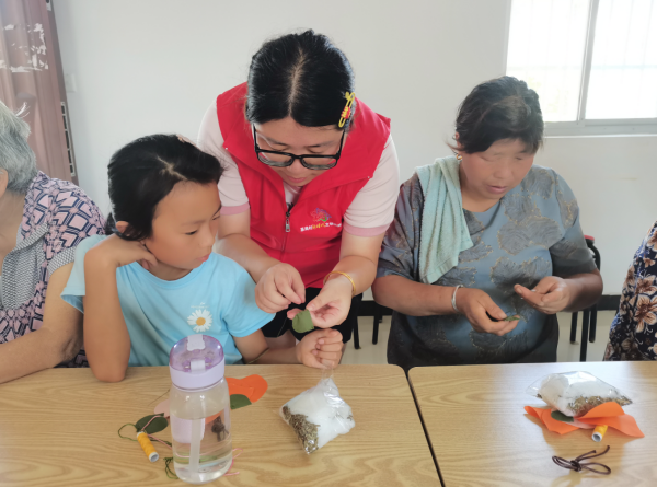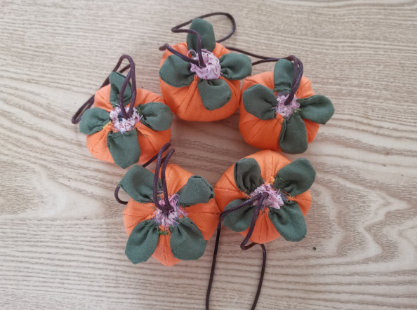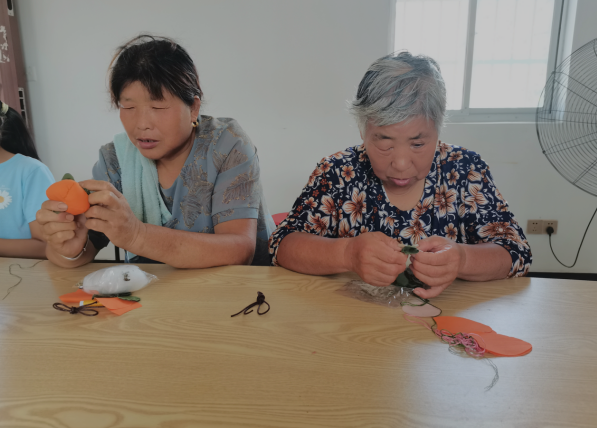 柿子香包掛件,事事如意的諧音,寓意著美好生活的祝愿。活動現(xiàn)場,志愿者給村民發(fā)放了柿子香包材料包,并且介紹了柿子香包的縫制方法步驟——對齊縫合、翻面整平、四角縫合、翻面穿繩、放入香囊、拉緊繩子......志愿者一步一步帶領(lǐng)村民學(xué)習(xí)縫制,大家從一開始的小心翼翼到熟能生巧,互相討論、互相幫助,邊縫制邊感觸道:“親手縫制個(gè)柿子包,希望家人事事如意。”在志愿者的耐心指導(dǎo)下,一個(gè)個(gè)精美雅致的柿子香包逐漸呈現(xiàn)在大家的眼前。