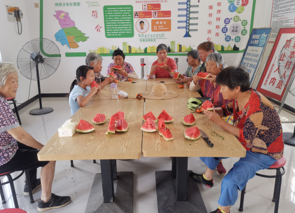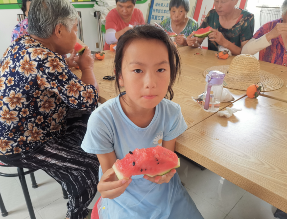 在“啃秋”環(huán)節(jié),志愿者切好西瓜發(fā)給村民,村民們一邊大口大口地吃著西瓜,一邊聽志愿者科普二十四節(jié)氣的由來以及立秋和“啃秋”傳統(tǒng)習(xí)俗的相關(guān)知識,每個(gè)人都“啃”得不亦樂乎,歡笑聲充斥著整個(gè)活動室。