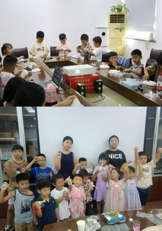 最后,志愿者帶領(lǐng)孩子們模擬考古恐龍環(huán)節(jié),小朋友們化身為勇敢的小小考古家,帶上防護鏡、手套,手拿小錘子等工具,全身心地投入到模擬考古土塊中挖掘“恐龍化石”。不久,小朋友們就“挖掘”出了不同的“恐龍化石”,大家拿著自己獨有的“考古”作品合影留念,現(xiàn)場傳來陣陣歡聲笑語。
