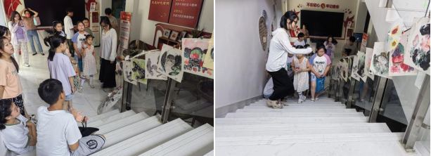 在盛大的結(jié)業(yè)典禮上,樓梯的扶手兩側(cè)陳列著孩子們創(chuàng)作的一幅幅栩栩如生作品。志愿者老師們向?qū)W員們的家長(zhǎng)們指出,他們的孩子們?cè)谶@段時(shí)間里取得了巨大的學(xué)習(xí)進(jìn)步,真正有所收獲,學(xué)有所成。