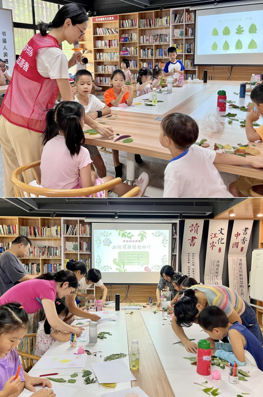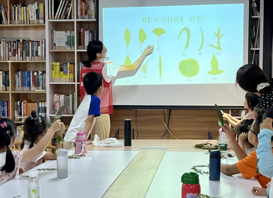 活動(dòng)開展前,社區(qū)志愿者們事先提醒孩子們當(dāng)天需準(zhǔn)備不同顏色、大小和形狀的葉子帶到書房?;顒?dòng)當(dāng)天,志愿者分享了植物的葉自然觀察書籍《繪認(rèn)植物第一課》、《好孩子的自然觀察課:葉》中的葉的作用、葉的結(jié)構(gòu)和葉的觀察等內(nèi)容。隨后,志愿者要求孩子們觀察葉片的顏色、紋路和質(zhì)地等特征。孩子們積極參與并用放大鏡仔細(xì)觀察手中的樹葉,不時(shí)互相交流發(fā)現(xiàn)。孩子們的好奇心被激發(fā)出來,對(duì)植物葉片的奇妙特征有了更深的了解。