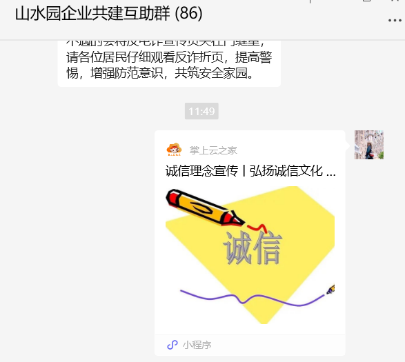 為深入推進誠信建設(shè)宣傳,營造全社會誠實守信、重信守諾的文明風尚,8月起,山水園社區(qū)開展誠信建設(shè)萬里行掌上云宣傳活動,依托云社區(qū)平臺,發(fā)布誠信學(xué)習(xí)鏈接,開展線上誠信宣講活動,引導(dǎo)居民樹立誠實守信價值觀,讓誠信宣傳走進千家萬戶。人無信不立,業(yè)無信不興,此次宣講受眾人群包括社區(qū)居民、青少年、個體企業(yè)經(jīng)營者,累計推送誠信宣傳20余次,讓大家充分認識到誠信是社會主義核心價值觀的重要內(nèi)容,建設(shè)社會信用體系離不開誠信建設(shè),同時在掌上云社區(qū)設(shè)置誠信宣傳知識競答,進一步加大宣傳效果,讓居民在潛移默化中了解誠信建設(shè)的重要性,營造“知信、守信、用信”的良好社會環(huán)境。