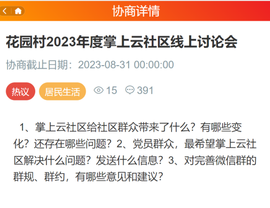 花園村充分利用掌上云社區(qū)平臺,做好黨建引領工作,拉近干群之間的距離,做好基層工作,更好為民服務。花園村希望通過此次討論會,了解黨員群眾所需所想,共建幸?;▓@。