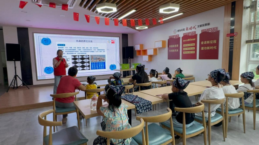 活動現(xiàn)場,志愿者們?yōu)楹⒆觽儙砹艘粓鼍实脑菊故?。志愿者講述了扎染技藝的起源故事,讓孩子們沉浸在歷史的長河中。志愿者們耐心細(xì)致地解釋了扎染的特點(diǎn),讓孩子們通過視聽與思考更深入地理解這門古老的藝術(shù)。