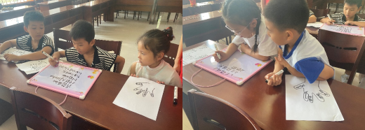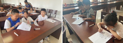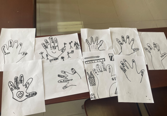 “說說我是誰”,組員們在畫板畫下自己的手印,并在五個(gè)手指上依次寫下姓名、年齡、特長、興趣愛好和學(xué)校班級(jí),并逐個(gè)進(jìn)行自我介紹。通過這個(gè)環(huán)節(jié),組員們可以更好地了解彼此,建立起友好的關(guān)系。