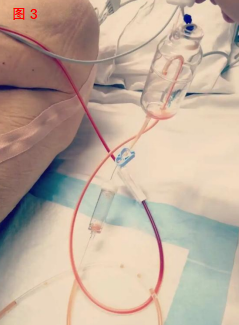 正當大家以為腎功能改善后,患者的狀況會一路好轉(zhuǎn),然而,患者并未出現(xiàn)想象中的明顯改善。復查血細胞分析,發(fā)現(xiàn)患者中度貧血,且患者仍然呈持續(xù)性頭痛及精神萎靡。針對這一情況,神經(jīng)外科及腎病科的專家們又開展了詳細地交流討論,并提出了治療建議:對患者施行腰大池引流術(shù)(圖3),減少出血對腦血管的痙攣刺激以緩解頭痛癥狀;每日輸注2個單位懸浮紅細胞、口服鹿血晶1—2g/日,改善血紅蛋白至100g/L以上;通過鼻飼管,每日輸注能全力兩瓶,改善患者營養(yǎng)狀況;繼續(xù)隔日床邊血液透析。