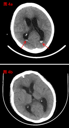 在神經(jīng)外科與腎病科的通力協(xié)作和精心救治下,患者精神狀態(tài)逐漸改善、飲食睡眠不斷好轉(zhuǎn),住院40天后,恢復良好,復查顱腦CT(圖4b)較入院時(圖4a,紅色箭頭處指示顱內(nèi)血腫)明顯吸收?;颊咝凶咦匀?,滿意出院!(神經(jīng)外科、宣傳科)
