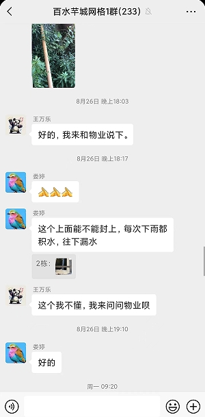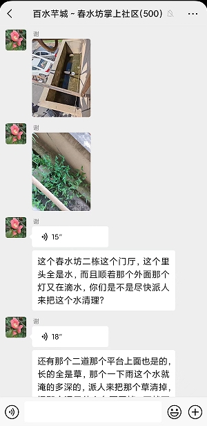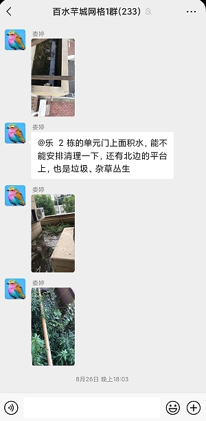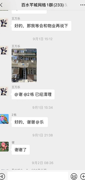 百水芊城社區(qū)網(wǎng)格員在“掌上云”微信群看到訴求后立刻前往現(xiàn)場查看,發(fā)現(xiàn)此處平臺日常保潔根本無法察覺到,只有住戶自己能看到,現(xiàn)場正如居民所述一致,確實(shí)是一處衛(wèi)生死角。當(dāng)即網(wǎng)格員聯(lián)系物業(yè)師傅帶上梯子和相關(guān)清掃工具,爬上平臺后把積水疏通,并將、雜草、淤泥、垃圾一同清理干凈,隨后網(wǎng)格員在“掌上云”微信群里告知訴求人,說明該處問題成功順利解決,社區(qū)及時(shí)有效的處理得到居民的一致認(rèn)可。