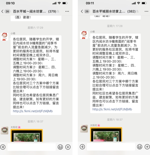 為更好的服務(wù)社區(qū)居民,以社區(qū)讀者所盼、所需為導(dǎo)向,有針對性地滿足群眾文化需求,百水芊城社區(qū)運用“掌上云社區(qū)”業(yè)務(wù)管理平臺,通過“小棲”機(jī)器人向小區(qū)微信群推送百水芊城小區(qū)“閱享書屋”的開放調(diào)整協(xié)商管理通知,通過線上協(xié)商留言方式邀請轄區(qū)居民集思廣益,建言獻(xiàn)策,在選擇好的開放方案同時也可以提出其他的方案。