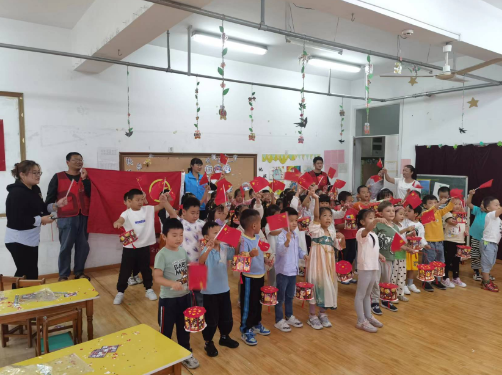今年中秋過后緊接著就是國慶,雙節(jié)同慶,燈籠制作完成后,由幼兒園老師帶領大班的小朋友合唱了一曲國歌,為即將到來的祖國的生日送上祝福,合唱結(jié)束后,每個小朋友一手拿著燈籠,一手拿著國旗進行合照,為此次的雙節(jié)同慶畫上圓滿的句號。