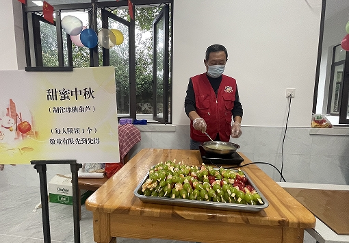 甜蜜中秋(制作冰糖葫蘆),社區(qū)志愿者為居民仔細(xì)講解了冰糖葫蘆的古老傳說和制作步驟,現(xiàn)場(chǎng)熬制糖稀,并邀請(qǐng)居民上前觀看。糖稀熬制完成后,居民用竹簽棒把各種水果串成小串,然后放進(jìn)糖稀里,均勻沾滿糖漿,一串串誘人的冰糖葫蘆就制作完成了。居民們滿足地吃著自己親手制作的冰糖葫蘆,臉上洋溢著幸福的笑容。