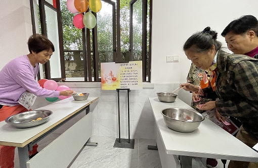 花好月圓(制作月餅),社區(qū)志愿者們將面粉、餡料、模具等一系列原材料,準(zhǔn)備妥當(dāng),并現(xiàn)場(chǎng)教學(xué)?,F(xiàn)場(chǎng)呈現(xiàn)一片繁忙的景象,居民們一邊揉搓面團(tuán),一邊壓膜,連小朋友都積極的參與進(jìn)來??粗约河H手制作的月餅,大家臉上都洋溢著幸福的笑容,香甜的味道縈繞在大家鼻尖,感受著濃濃的節(jié)日氛圍。