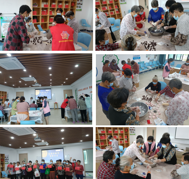 接下來(lái)是制作月餅環(huán)節(jié),志愿者分別介紹餅皮、餡料、模具等制作材料的用量和制作方式,并詳細(xì)指導(dǎo)月餅的制作過程。老人們摩拳擦掌,動(dòng)手揉餅皮、加餡料、包月餅、放入模具按壓成型,一邊探討著月餅的制作方法,一邊互相傳遞鮮花、花生、葫蘆、小兔子等形狀的月餅?zāi)>?。?jīng)過近一小時(shí)的制作,一個(gè)個(gè)色澤鮮艷、小巧玲瓏的月餅呈現(xiàn)在每個(gè)人的手中,并由社區(qū)志愿者組織集體合影留念,定格美好瞬間。