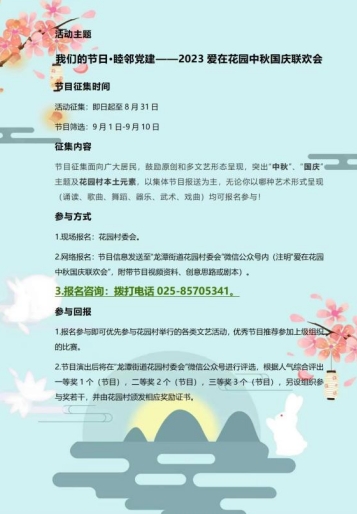 為弘揚(yáng)和傳承中華民族優(yōu)秀傳統(tǒng)文化,豐富居民群眾的精神文化生活,營造濃厚的節(jié)日氛圍,花園村黨委依托掌上云社區(qū)舉辦“迎盛會 聚鄰里 黨群攜手心連心”中秋國慶文藝匯演,通過掌上云社區(qū)招募演出隊(duì)伍及志愿者,豐富演出內(nèi)容。