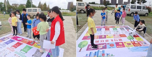 講解結(jié)束后,一場垃圾分類飛行棋趣味游戲讓孩子們更深入地了解垃圾分類的重要性。游戲中,孩子們依次擲骰子,根據(jù)骰子點數(shù)前進相應(yīng)的步數(shù),然后停在相應(yīng)的格子上。在每個格子上,孩子們需要在限定的時間內(nèi)回答出該格子上的物體是屬于哪種垃圾,以及正確的投放方式。孩子們玩得十分常投入,當(dāng)他們站在格子上時,大家都在竭盡全力地思考和回答問題?,F(xiàn)場充滿了歡聲笑語和互動交流的聲音。