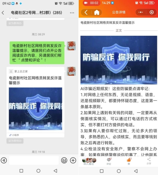 為了更好地傳遞宣傳信息,電瓷新村社區(qū)利用線上掌上云社區(qū)網(wǎng)格群的推廣方式,廣泛宣傳防范電信網(wǎng)絡(luò)詐騙的知識(shí)和技巧。通過(guò)發(fā)布相關(guān)知識(shí)文章、轉(zhuǎn)發(fā)預(yù)防警示信息等方式,社區(qū)居民可以隨時(shí)隨地獲取相關(guān)的防范詐騙的信息。