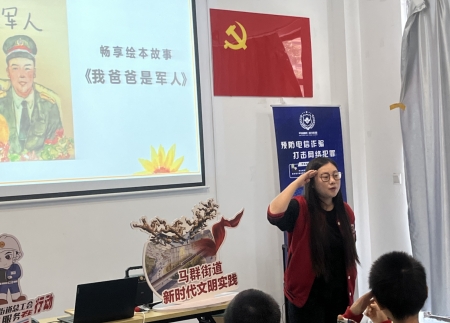 活動開始,社區(qū)志愿者以繪本故事《我爸爸是軍人》切入主題,向小朋友們介紹了解放軍的真實生活、軍營的環(huán)境等。并通過孩子的視角,再現(xiàn)了1998年抗洪搶險時,中國軍人英勇無私的形象,及軍民一家親的感人場面。