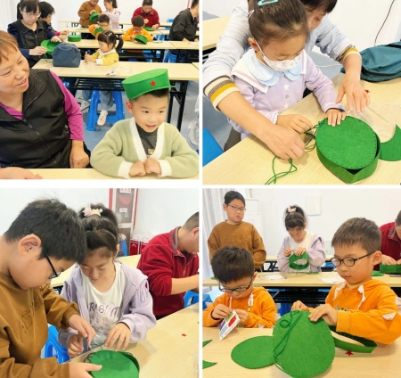 之后,志愿者們分發(fā)制作軍帽的活動材料,一步一步詳細地為小朋友們講解了軍帽的制作流程。小朋友們在家長的幫助下認真地穿針、縫線、粘貼,頂頂漂亮的軍帽就完成了。制作完成后,孩子們迫不及待地戴上自己親手制作的軍帽,一個個精神抖擻的“小軍人”出現(xiàn)在大家面前。
