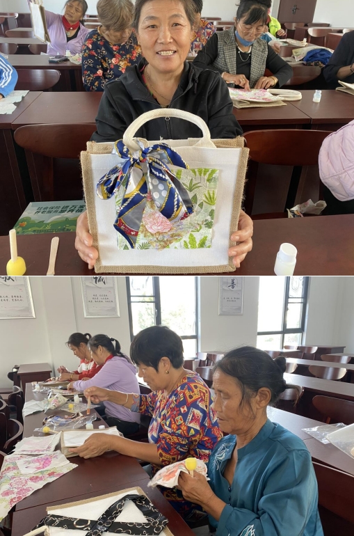 而后,志愿者們通過PPT和視頻的形式,向大家展示了手工制作蝶骨巴包的方法和注意事項。每人都收到了一個帆布包制作材料包,志愿者們引導(dǎo)大家自行發(fā)揮想象力,激發(fā)創(chuàng)意,開始進行制作。一雙雙靈巧的雙手在活動室里翻飛,一張張笑臉在每個人的臉龐綻放,充滿了童真與喜悅。志愿者們不辭辛勞地幫助每一位需要幫助的村民,耐心地解答他們遇到的問題。大家相互之間分享了制作過程中的心得和體會,互相鼓勵和贊美。