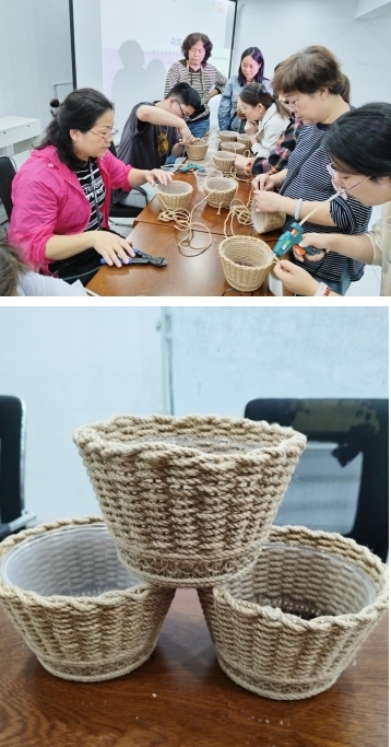 活動(dòng)現(xiàn)場(chǎng),社區(qū)工作人員、志愿者向居民們講解苧麻編織花籃的方法、步驟,并進(jìn)行了示范,居民們認(rèn)真聽(tīng)講解、仔細(xì)看示范,學(xué)習(xí)其中要領(lǐng)。在工作人員與志愿者的指導(dǎo)下,大家開(kāi)始動(dòng)手制作,大家先用膠槍將麻繩粘在托盤上,再用麻繩一圈一圈地纏繞花桿,居民們互幫互助,團(tuán)結(jié)友愛(ài)。一邊編織著花籃一邊嘮家常,回憶過(guò)去,居民之間交流與互動(dòng),樂(lè)趣無(wú)窮。