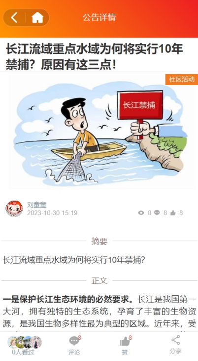 線上,社區(qū)網(wǎng)格員在掌上云社區(qū)內(nèi)發(fā)布《長江流域重點水域為何將實行10年禁捕?原因有這三點!》文章;線下,也通過活動開展了科普禁捕,同時也讓大家直觀地感受到過度捕撈不僅是對生態(tài)環(huán)境平衡的破壞,也是對長江漁業(yè)資源可持續(xù)的破壞,通過線上線下配合宣傳長江禁捕,可以吸引到更多的社區(qū)居民對長江生態(tài)環(huán)境的保護(hù)與參與,也可以通過專業(yè)知識讓居民了解到長江漁業(yè)資源保護(hù)的重要性。