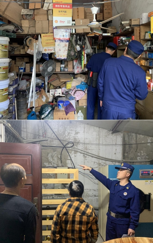 社區(qū)工作人員與特勤隊員對于“九小場所”安全出口是否暢通、消防設(shè)施是否正常運行、是否存在電線私拉亂接等現(xiàn)象進行檢查。