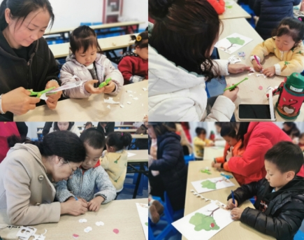 繪本故事結(jié)束后,社區(qū)志愿者繼續(xù)帶領(lǐng)小朋友們開始了手工——家庭樹的制作。每一顆蘋果果實(shí)就代表了一個愛自己的家人,小朋友們仔細(xì)地剪,細(xì)致的貼,又在蘋果上畫了每一個家庭成員的頭像。一些會寫字的小朋友,不僅畫了頭像,還在旁邊寫上了愛的稱呼,爸爸、媽媽、爺爺、奶奶等等。在制作家庭樹的過程中,一同陪伴孩子參與活動的家長也和孩子們有愛的交流著,討論著每個家人的頭像該怎么畫,感受到了孩子與家人之間的親密情感,有愛的關(guān)系。