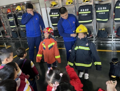 為了提升孩子們的探索體驗,在消防員的幫助下,孩子們親身試穿了消防滅火戰(zhàn)斗服和消防頭盔等裝備,同學們在身著搶險救援服全套裝備后,孩子們不時發(fā)出一陣陣驚呼:“哇塞,實在是太酷了,以后我也要當消防員”!當孩子們套上氧氣面罩,來回走動時,不一會就由衷地發(fā)出感嘆“好累,消防服好重,面罩好悶,消防員叔叔真的好辛苦。”
