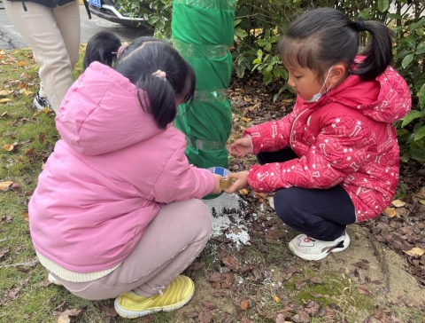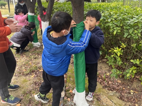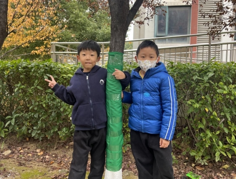 雖然天氣寒冷,但孩子們的熱情絲毫不減?;顒?dòng)中,志愿者老師一邊講解,一邊示范如何給小樹(shù)穿冬衣。孩子們躍躍欲試,他們?nèi)齻€(gè)一群,五個(gè)一伙,合力為小樹(shù)裹上為樹(shù)木穿上了一件件“防寒衣服”。