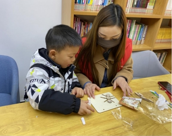 活動現(xiàn)場,志愿者先帶小朋友們認識樹枝粘貼畫的材料,然后為小朋友們講解具體的粘貼制作過程,接著,志愿者給小朋友們分發(fā)了樹枝畫框及材料包,并鼓勵大家按照自己的想法制作。小朋友們紛紛動起小手,發(fā)揮自己的想象力,將零碎的木塊進行組合粘貼,把自己的想法和創(chuàng)意通過手工制作呈現(xiàn)出來,整個制作過程中,時而安靜,時而喧嘩,也會互相幫助,現(xiàn)場氣氛很是熱鬧。很快,在志愿者和家長的幫助下,一幅幅色彩鮮艷,極具個人特色和想法的樹枝畫就在小朋友的手中誕生了。